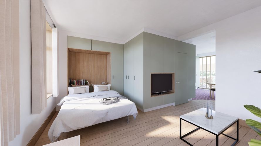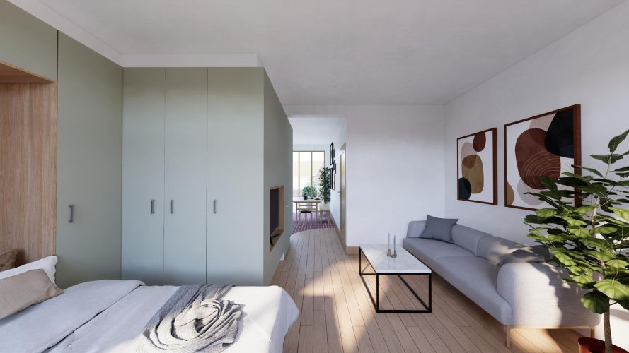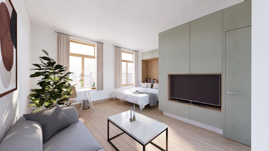 In de 28 studio’s draait alles om slim ruimtegebruik. Door de multifunctionele indeling beweegt de ruimte mee met jouw dag. Dankzij de grote, originele raampartijen zijn de studio’s licht en open. Compact in oppervlakte, ruim in beleving
